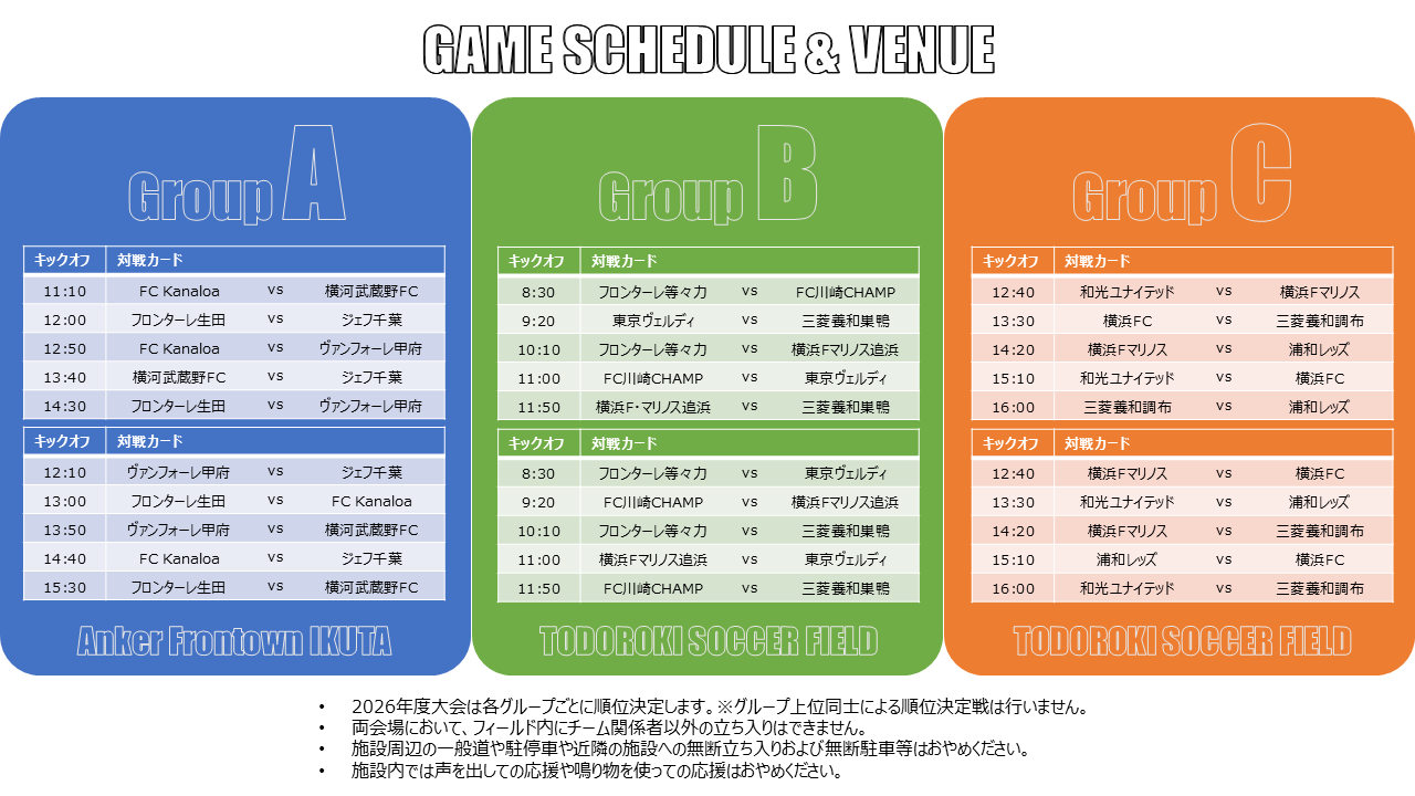 FC Kanaloa、FC川崎CHAMPジュニアユース、和光ユナイテッド川崎FC
